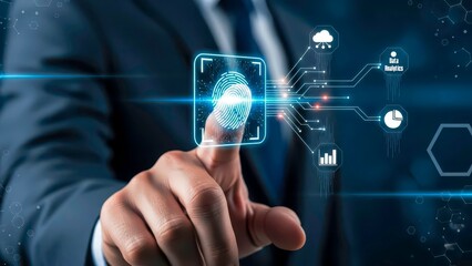 Businessmans Finger Scanning Biometric Fingerprint for Secure Digital Data Access and Cloud Analytics