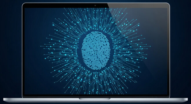 Futuristic biometric identification technology concept with a digital fingerprint or iris scan on a modern laptop screen