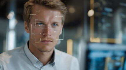 A fintech analyst verifying a customer’s identity using biometric face-match software, holographic overlays aligning features with precision — digital security, KYC compliance, and frictionless