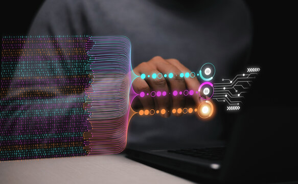Data Stream Visualization: Digital stream background with glowing, blurred data packets conveys connectivity and digital future.
