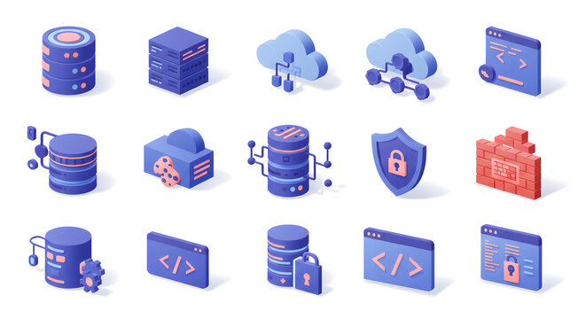 Essential isometric icons for modern data management, cloud computing infrastructure, cybersecurity solutions, and software development processes, perfect for digital projects