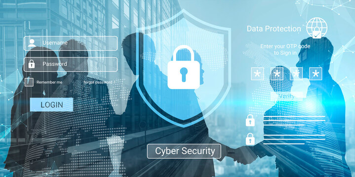 Visual representation of cyber security featuring a login screen, data protection elements, and two professionals shaking hands, emphasizing collaboration and trust in a digital world. Gantry