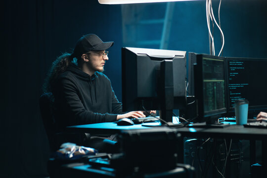 Internet crime concept. Hacker working on a code on dark digital background with digital interface around.