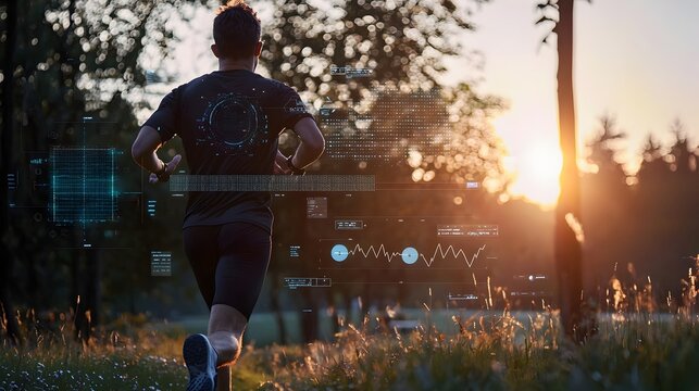 A person interacts with a futuristic holographic interface displaying data and analytics, emphasizing technology and fitness.