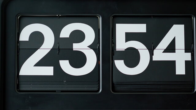 Closeup retro flip clock with white numbers on black background. Macro flipclock
