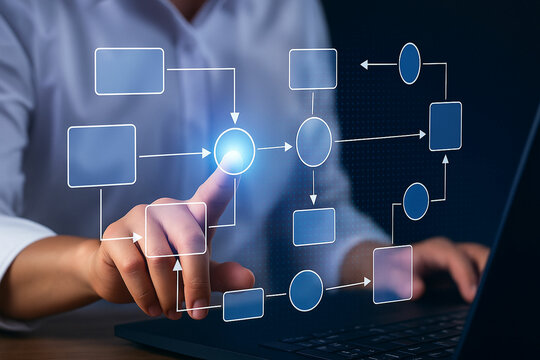 Person s finger interacting with a digital flowchart on a futuristic interface