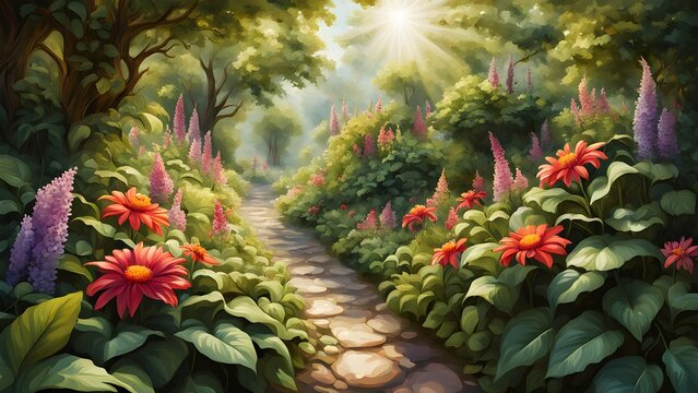 Sunlit stone path winding through a vibrant enchanted forest garden bursting with colorful flowers.