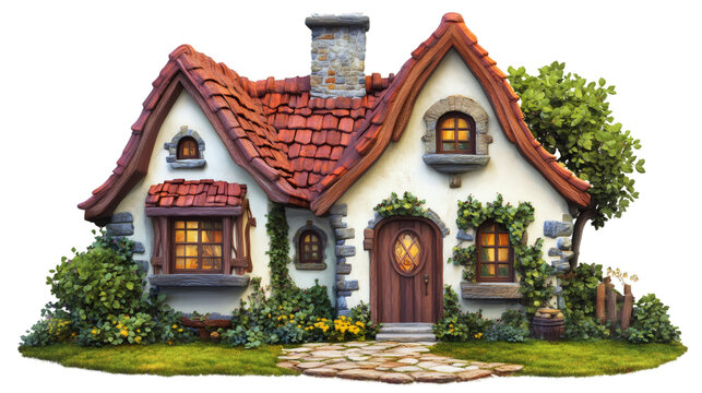 Whimsical fairytale cottage glowing softly, nestled among garden flowers during twilight, transparent background perfect for digital design compositions