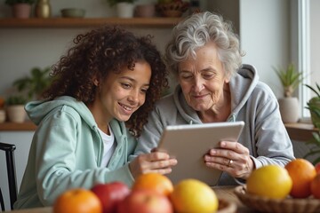 Grandmother and her granddaughter are sitting comfortably on a couch, sharing a heartwarming moment as they browse the internet together on a smartphone