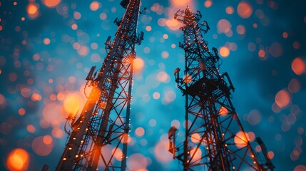 At majestic dawn, a mountain tower broadcasts signals across the sky, embodying wireless technology.