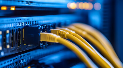 Fiber Optic Cables Glowing with Blue Light, Modern Technology and High Speed Internet Connection