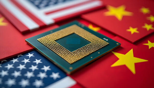 USA and China flags on computer microchips on a circuit board, symbolizing semiconductor trade and technology rivalry