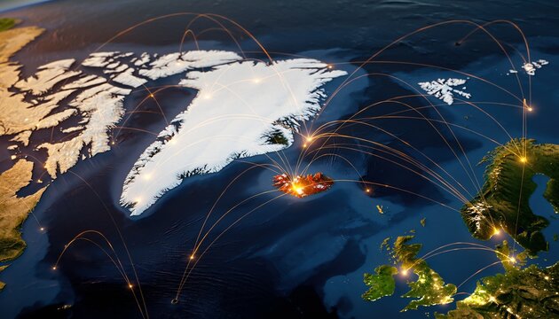 Economic war global network shown, Iceland as central hub, glowing lines link continents, symbolizing trade, finance, conflict, security, international relations, and communication.