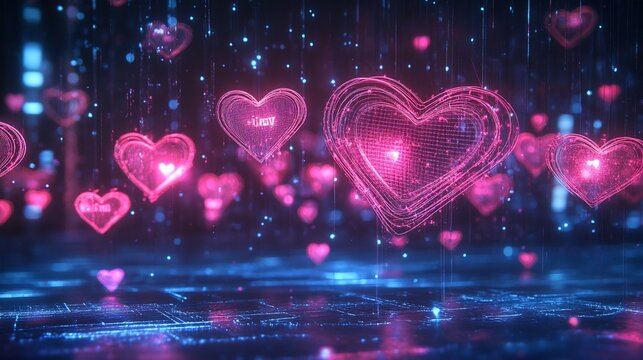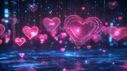 Digital Love Hearts Floating in a Cyberpunk Rain with a Neon Light Effect