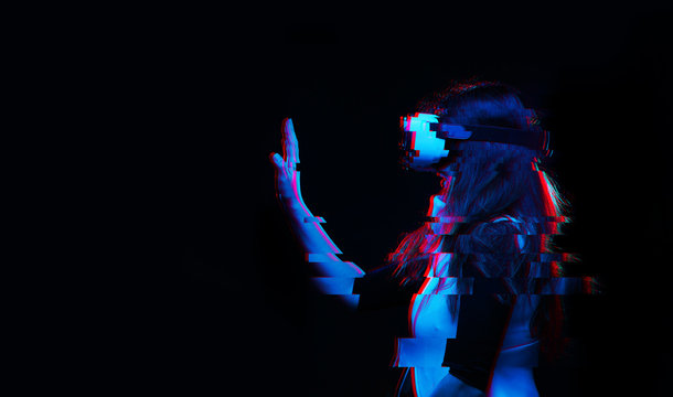 Woman is using virtual reality headset. Image with glitch effect.