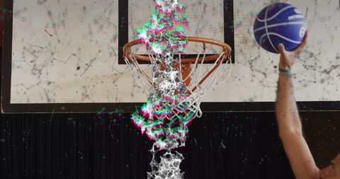 Shooting basketball player reaching for hoop with purple ball and neon glitch trail action