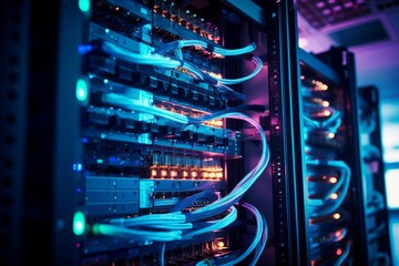 Powerful server room featuring modern network infrastructure for reliable data storage and processing, ensuring optimal performance and security solutions