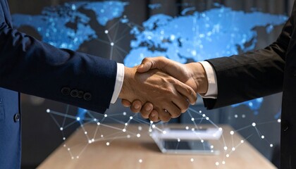 Business handshake with global digital network backdrop