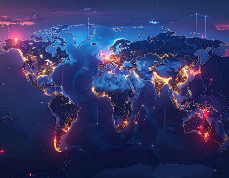 Illuminated digital world map with connected data points, night view