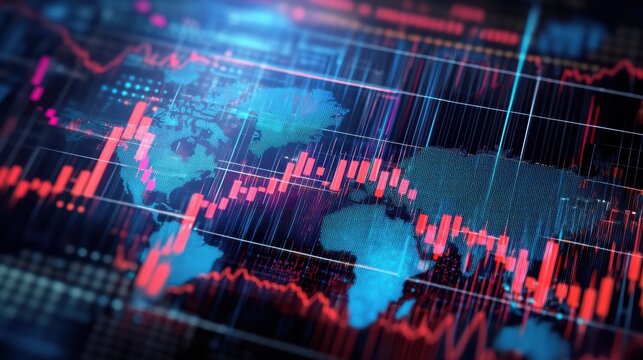 Global financial market trends overlaid on a world map.