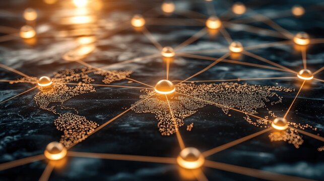 Global digital network map showing glowing nodes, luminous data flows and interconnected routes