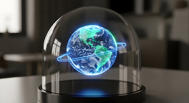 Futuristic earth globe under glass dome with glowing elements and orbits depicting technological