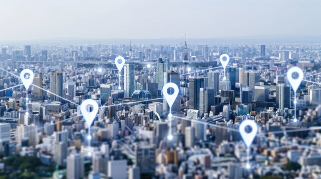 An aerial view of a modern city with multiple location pins connected by lines, symbolizing interconnectedness and communication