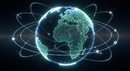 Global network graphic, a stylized representation of the Earth's surface interconnected by luminous lines and points