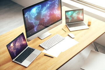 Modern computer display with abstract graphic world map, big data and networking concept. 3D Rendering