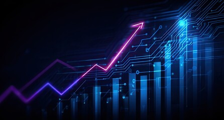 Tech-infused image of data graphs, ascending arrow, digital circuits, and vibrant lighting