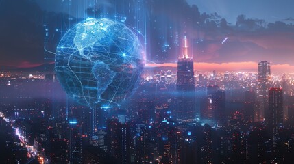 Futuristic Cityscape with Digital Globe and Skyline at Dusk