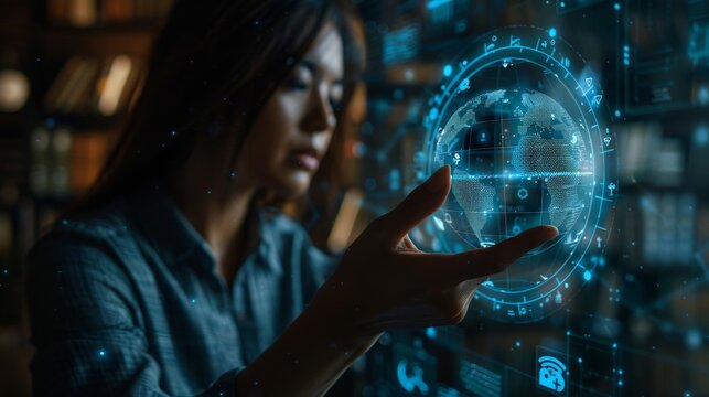 Woman analyzing digital holographic globe interface in a futuristic setting symbolizing global technology and data interaction