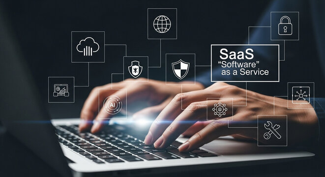 Person typing on laptop with software as a service icons overlayed on the image in dark setting
