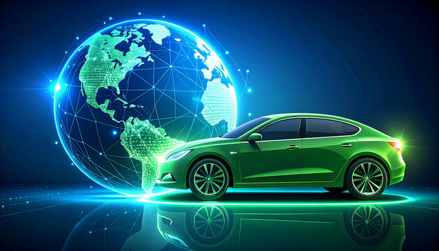 A vibrant image of a green electric car with a digital globe representing global connectivity.