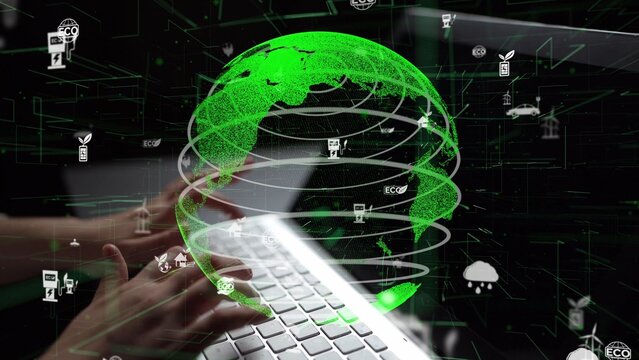 A vibrant green globe surrounded by digital technology symbols, illustrating themes of sustainability and eco-friendly innovations while showcasing a laptop in this futuristic scene. Xenic