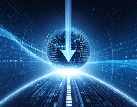 Futuristic digital concept of a glowing globe with binary code and a down arrow, representing data transfer. Ideal for technology, cloud computing, and global connectivity themes.