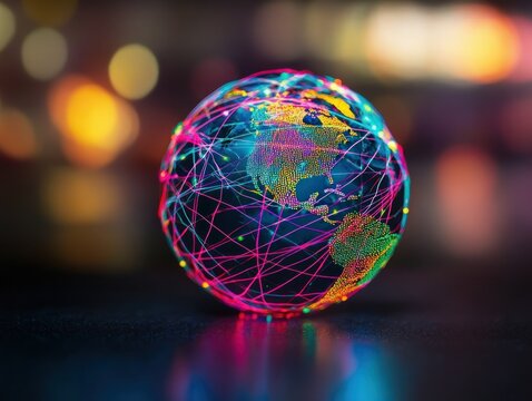 Vibrant glowing network of light connections encircling the Earth in a digital representation of global connectivity.