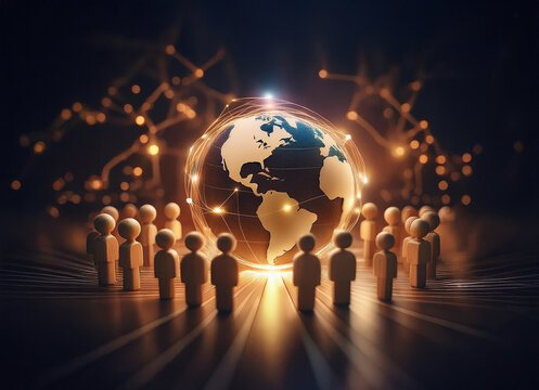 Glowing digital earth encircled by connected figures, symbolizing global network and community.  Illuminated nodes represent interconnectedness and worldwide communication.