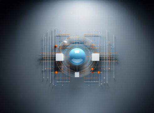 Abstract digital artwork featuring a central blue sphere encased in transparent geometric structures, illuminated by a spotlight, suggesting technological advancement and innovation.