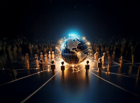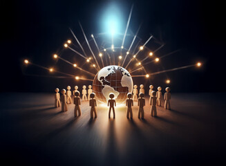 Global network concept.  Wooden figures encircle a glowing Earth, interconnected by lines of light, symbolizing worldwide communication and connection.