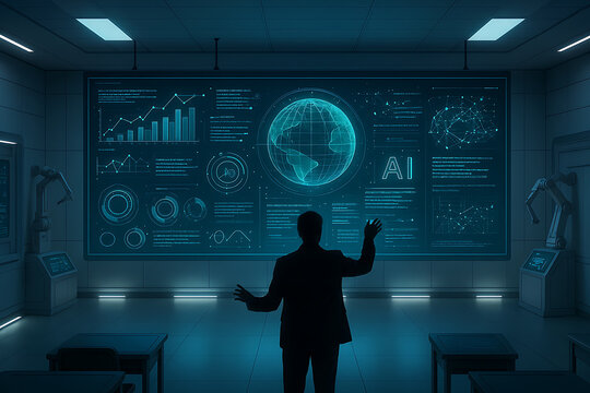 Artificial intelligence ai technology data analysis and machine learning in futuristic digital interface room