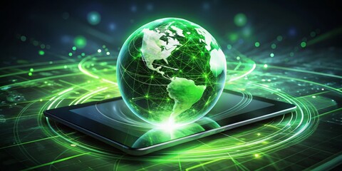 Glowing Green Globe on Sleek Black Tablet A Dynamic Digital Illustration Showcasing Interconnectedness with Radiating Lines, Set Against a Blurred Green Background for Depth and