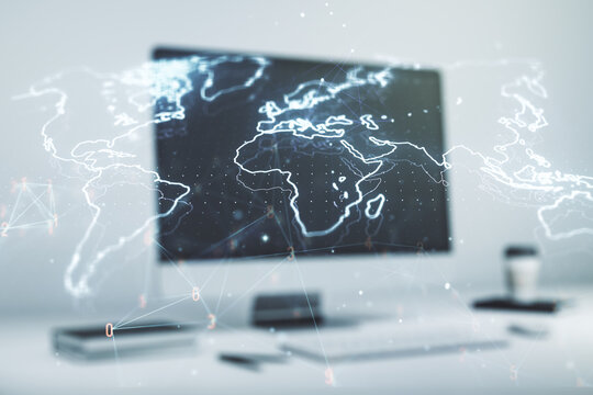 Double exposure of abstract digital world map on computer background, big data and blockchain concept