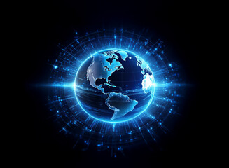 A glowing blue digital Earth surrounded by radiating light streams, symbolizing global connectivity and digital technology.