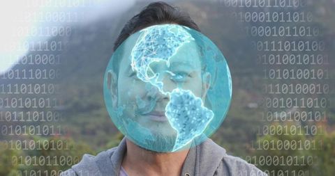 An abstract digital globe with a binary code overlay represents global communication and technology