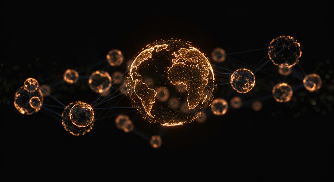 Digital globe surrounded by network connections, against a backdrop of abstract data streams and glowing shapes, representing global connectivity.