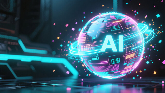 Glowing AI sphere with neon circuit grid and floating particles, perfect for futuristic background, digital backdrop, and cyber-themed wallpaper visuals