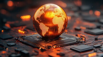A glowing globe over a circuit board, symbolizing global technology and innovation in a digital world.