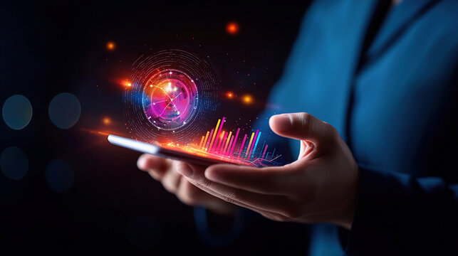 person holds smartphone displaying holographic interface with vibrant data visualizations, including graphs and digital globe, symbolizing advanced technology and AI integration