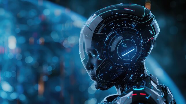 A futuristic visualization showcasing a robot with artificial intelligence, featuring biometric scanning and 3D scanning capabilities in a polygon vector wireframe concept.